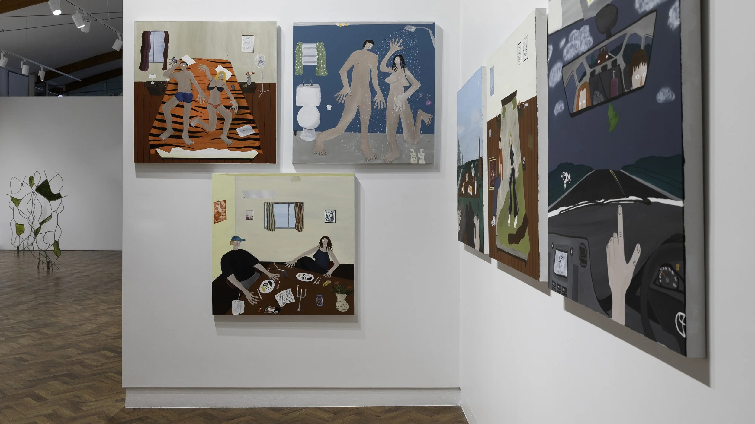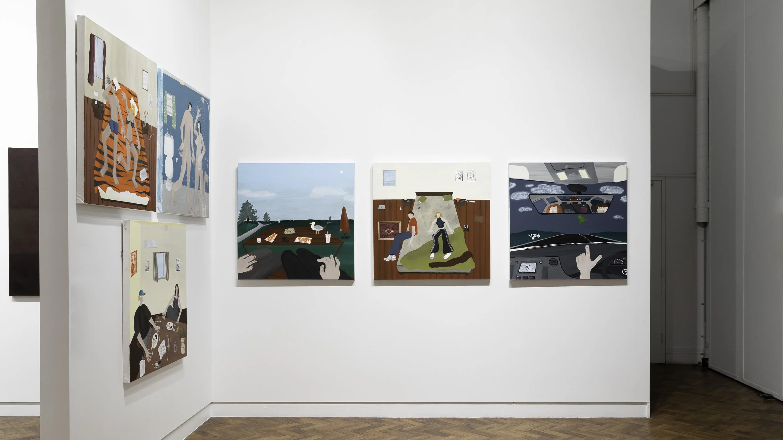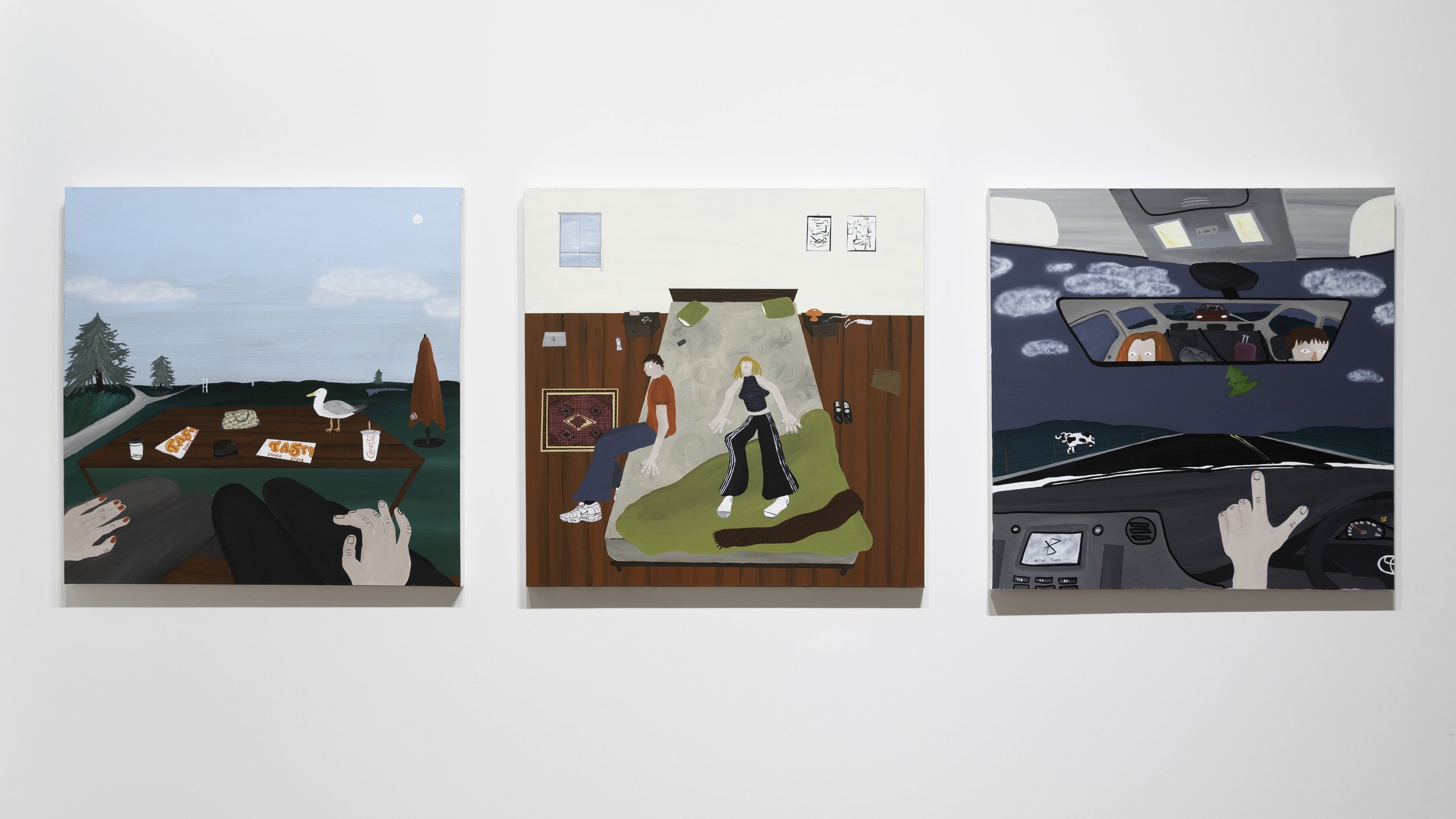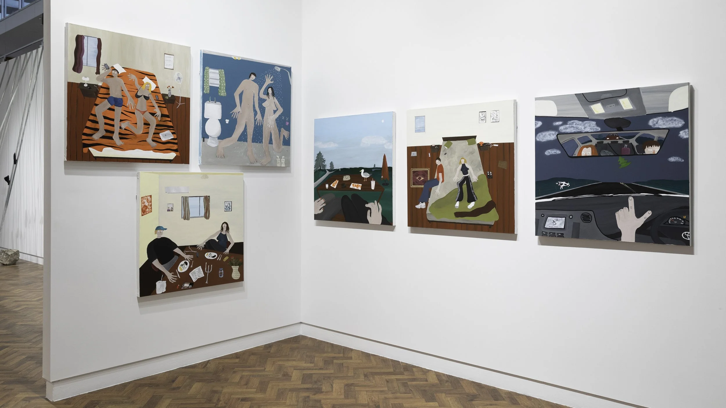 The paintings present figures in familiar scenarios, a meandering car journey, a slow morning, or a quiet afternoon with friends, that speak to personal memories for viewers. By deliberately distorting proportions of figures and their environments, Taylor has created a visual language aiming to capture the quintessence of romantic relationships. Long limbs and looming vistas convey the feeling of shared memories with loved ones as cherished pockets of lingering, precious time. Stripped of narrative and devoid of judgment, the paintings omit elements that might assert narrow perspectives or opinions, instead using ambiguity to create space for interpretation.
